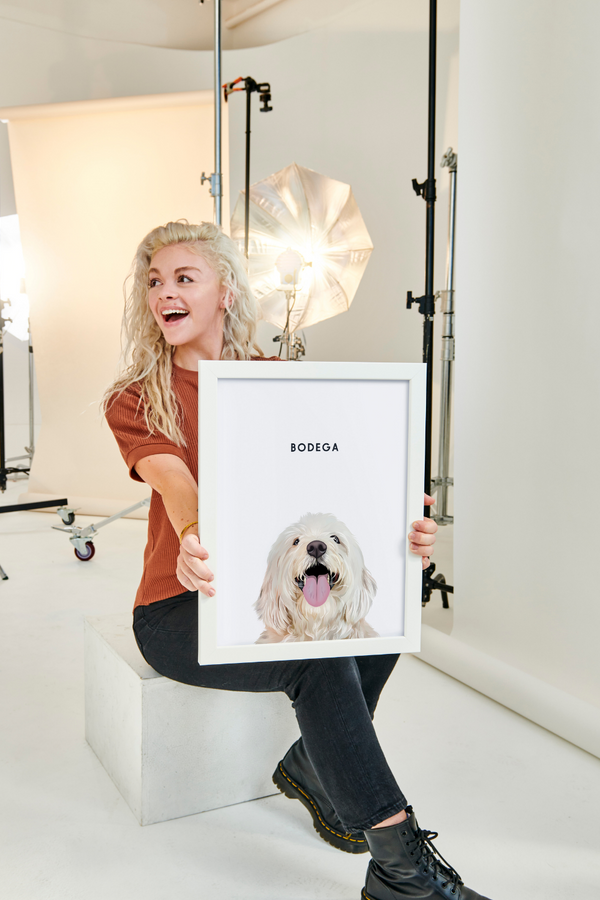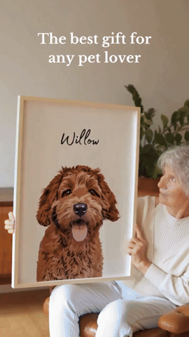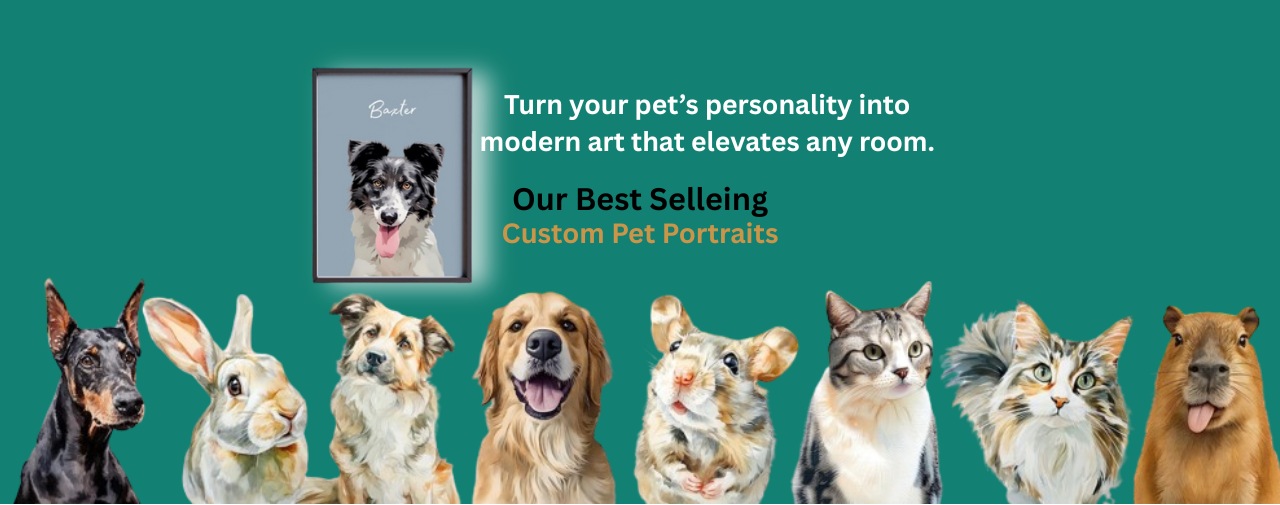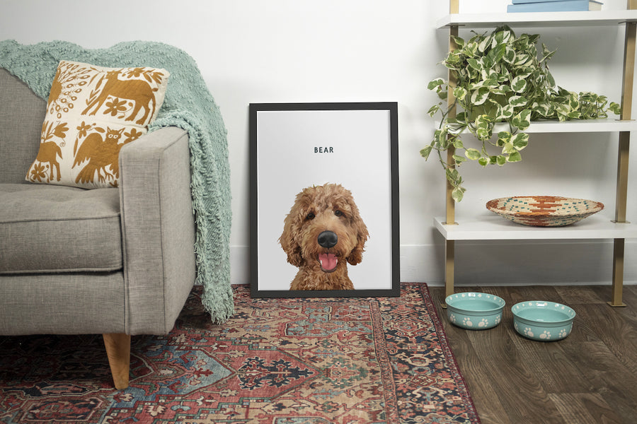 Pet portraits are printed on gallery-quality paper and ready-to-hang components come pre-attached to the high-quality frame.